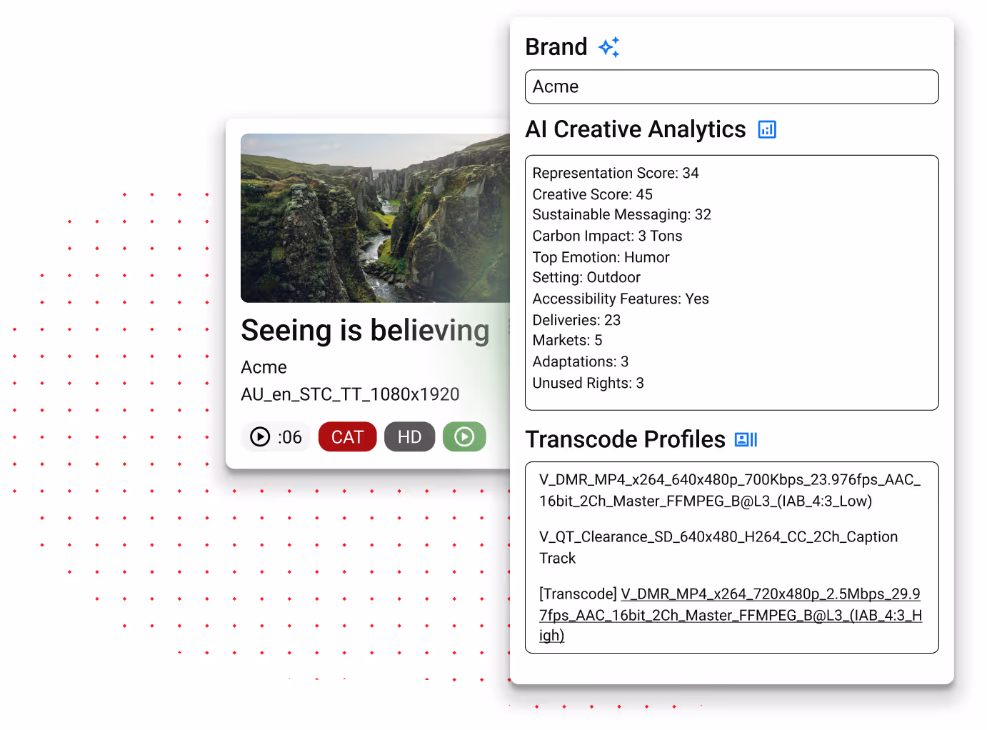 No more blind spots or searching across silos. With AI-powered tagging, universal creative IDs and organized assets, teams can instantly find, adapt and distribute content—with speed and precision.
