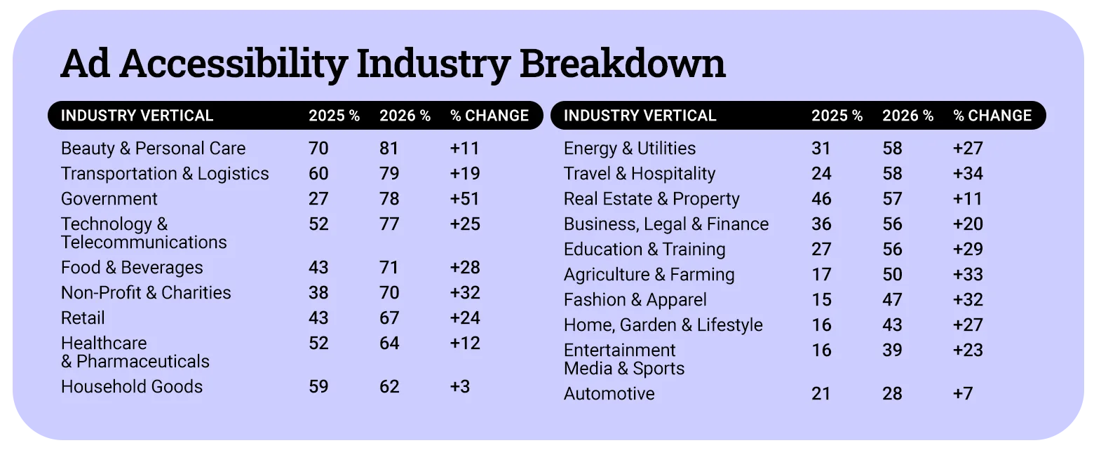 The XR data highlights both progress and gaps. Government advertising saw the steepest rise of any sector, up 51 percentage points, while Beauty and Personal Care leads all categories with 81 percent ofads subtitled. Automotive, however, lags behind at just 28 percent, the lowest of any industry tracked, pointing to a persistent accessibility blind spot that the sector has yet to address.